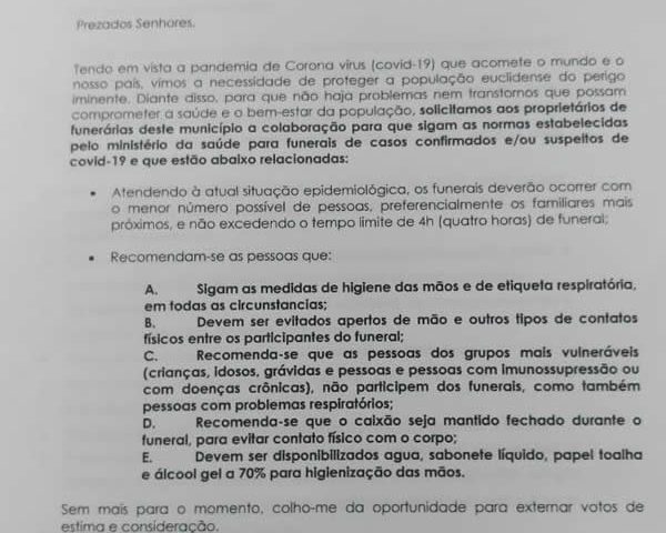 Parecer da Secretaria Municipal de Saúde de Euclides da Cunha anuncia regras sobre os serviços de óbitos no âmbito municipal. De acordo com o Ofício…