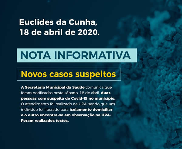Na tarde desse sábado, 18, a Secretaria Municipal de Saúde comunicou que surgiram mais dois casos suspeitos de Coronavírus (covid-19). Duas pessoas obtiveram atendimento em uma UPA (unidade de pronto atendimento), um indivíduo com sintomas leves foi liberado e deverá cumprir o isolamento domiciliar, porém o outro caso suspeito encontra-se em observação, ambos realizaram os testes e ficaram no aguardo dos resultados. Atualmente o boletim epidemiológico – COVID-19 de Euclides da Cunha, Bahia, fica sequenciado com os seguintes números: 11 casos notificados, 02 casos aguardando resultado, 03 em isolamento domiciliar, 07 descartados e apenas 01 caso confirmado em teste positivo de Coronavírus (covid-19).