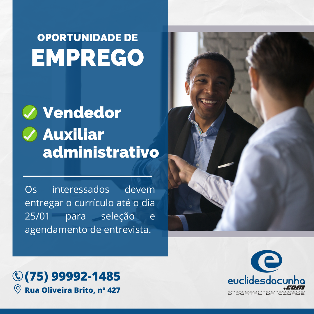 São duas vagas disponíveis, uma para vendedor lojista e outra para o cargo de Auxiliar Aministrativo na mesma empresa. Se você atende aos requisitos, deverá deixar o currículo na sede da CDL , sendo opcional a impressão de foto, que fica localizado na R. Oliveira Brito, nº 427 – Centro, Euclides da Cunha, BA.