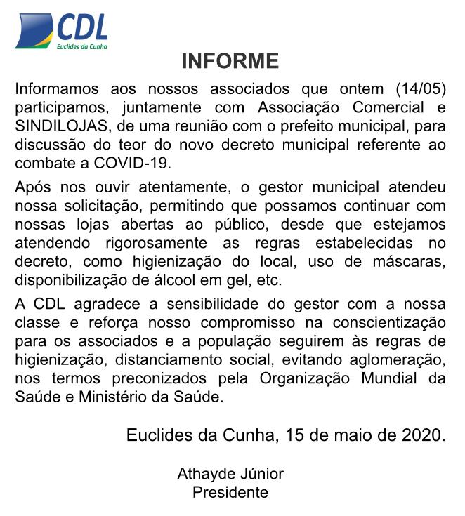Cidade Online Informe da Câmara de Dirigentes Lojistas de Euclides da Cunha (CDL) Redação 15 de maio de 2020 Nenhum Comentário